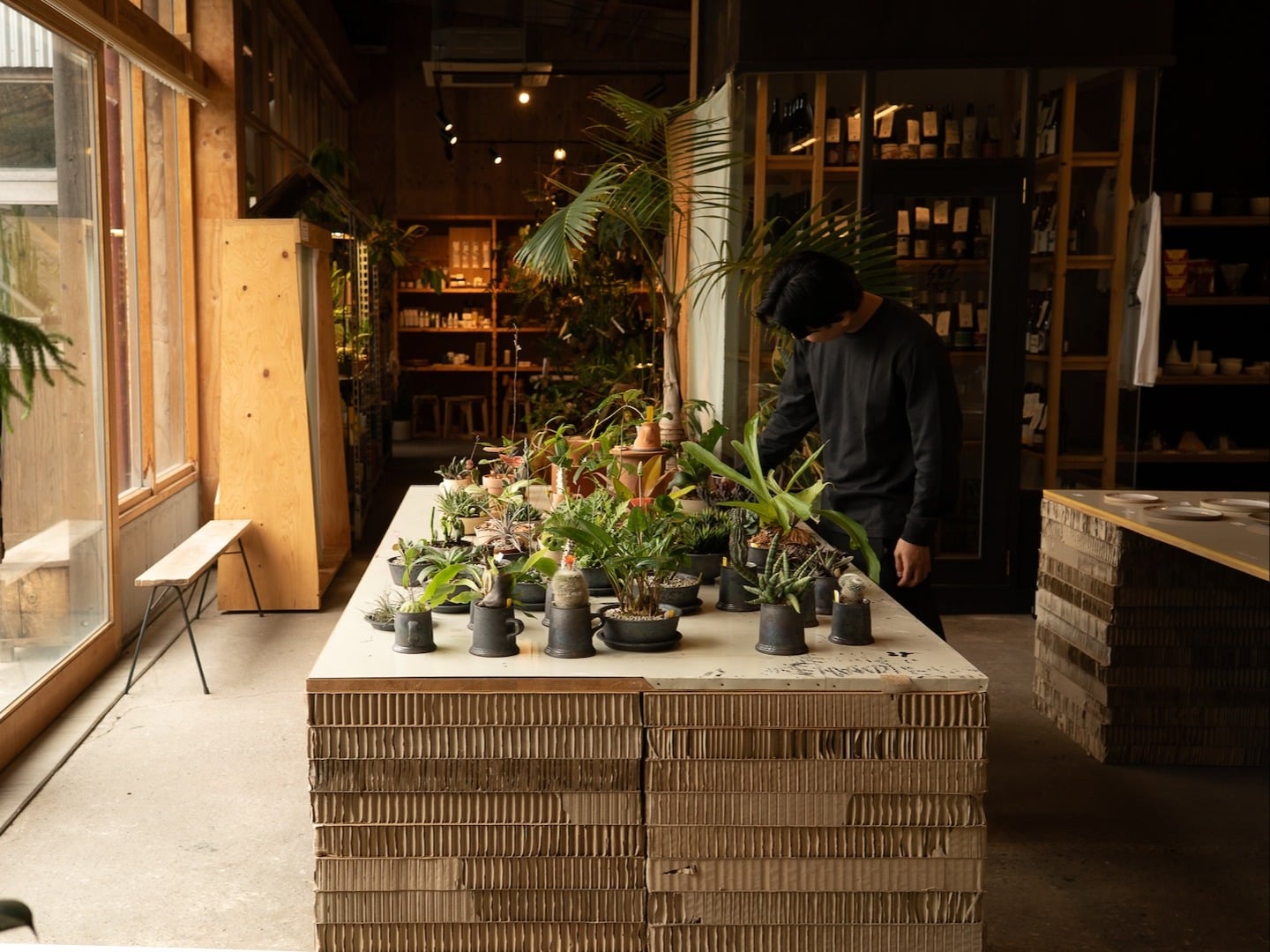 美味しいチーズケーキとコーヒー、ナチュラルワイン。クラフトの仲間たちの作品。 衣食住のさまざまなものが並び、そのどれにも、彼ららしい感覚がにじんでいる。 植物に囲まれた空間で、音も心地よい。気づけば、時間が過ぎている。